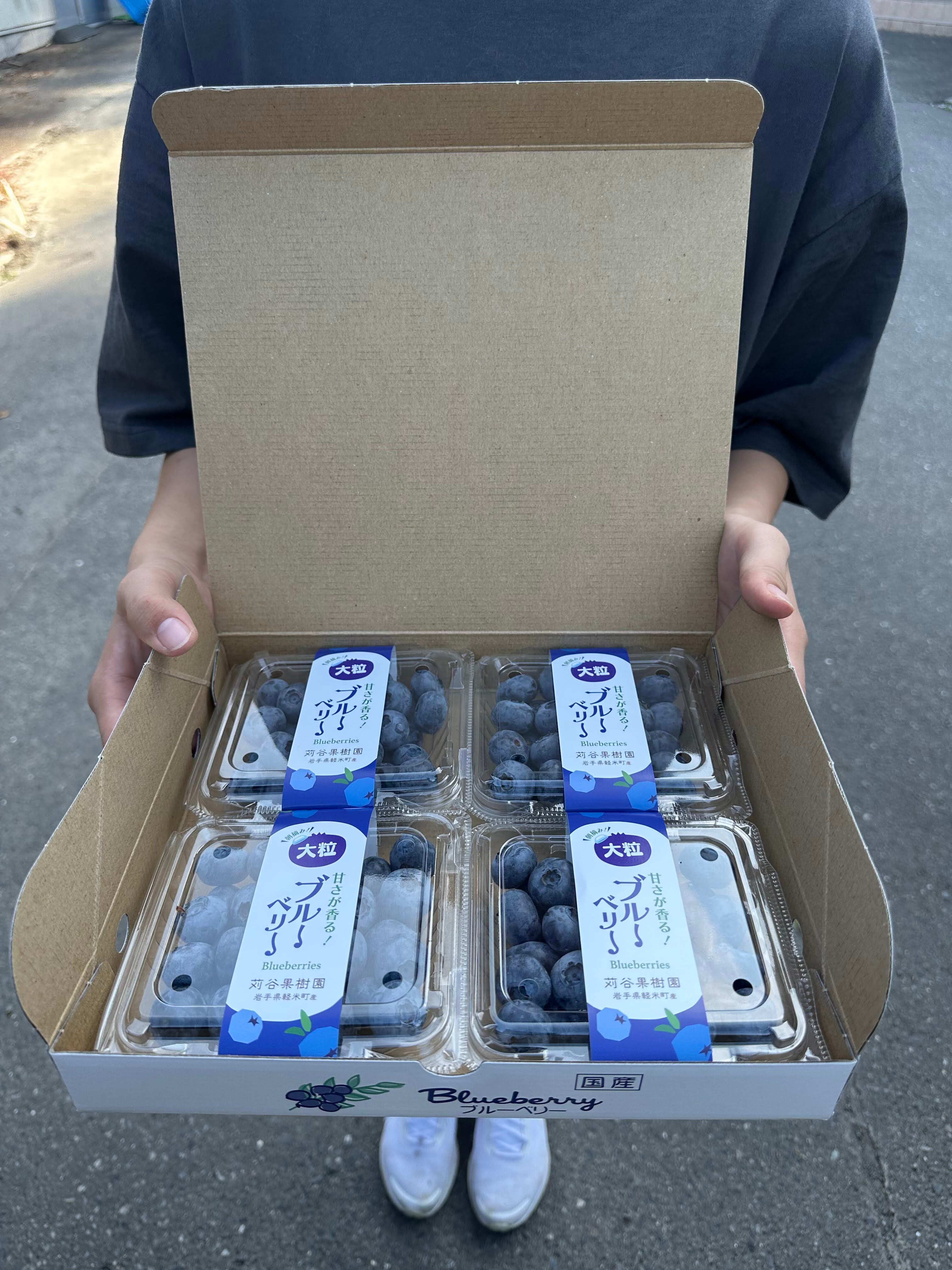パックに小分けしたブルーベリーを箱に詰めてお届けいたします。